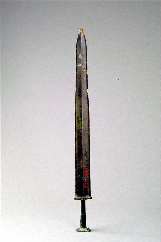 劍,古代冷兵器,屬于“短兵”,乃是兵中王者,被稱為“百兵之君”。開雙刃身直頭尖,橫豎可傷人,擊刺可透甲,兇險異常,生而為殺。也用以佩帶,以顯示貴族的身份地位。青銅劍,一般是銅、錫合金冶煉鑄造而成的,商周時期開始出現(xiàn),春秋戰(zhàn)國時期達到頂峰,一直延續(xù)到秦漢,隨著鐵劍的出現(xiàn)才銷聲匿跡。越王劍,本是越王所鑄之劍,也可用于賞賜和饋贈。