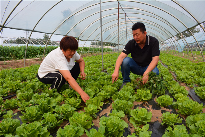 圖一:7月13日, 王爭(zhēng)林、張翠夫婦正在查看大棚生菜長(zhǎng)勢(shì)。