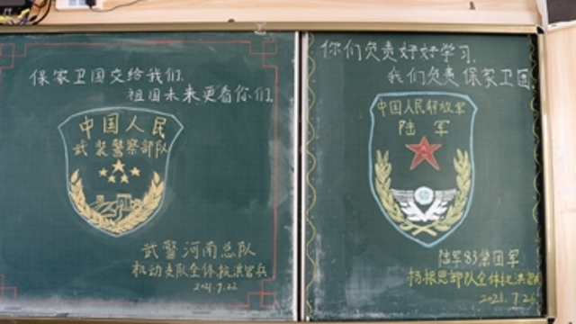 ??“保家衛(wèi)國交給我們,祖國未來更看你們!”“你們負責好好學習,我們負責保家衛(wèi)國!”在鄭州市第七十三中學的一間教室里,參與救災援助的抗洪官兵們給同學們留下了兩幅黑板報。在師生們眼里,這就是名副其實的“最美黑板報”。