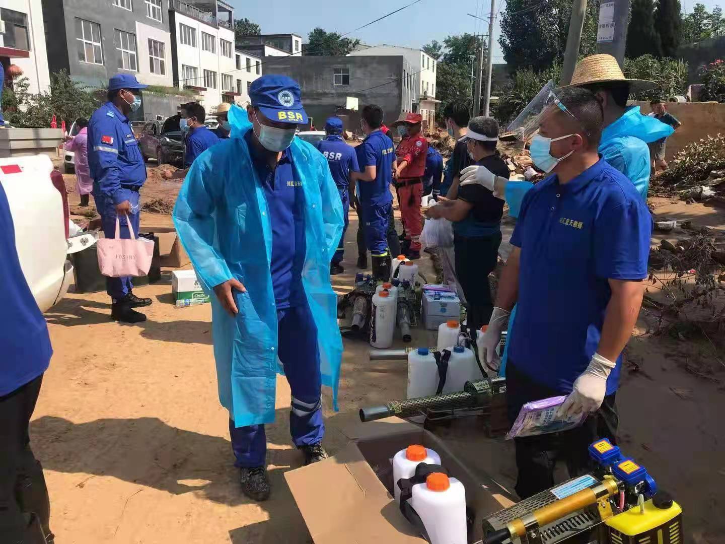 7月29日上午10時(shí),在隊(duì)長(zhǎng)肖永德的帶領(lǐng)下,周口川匯藍(lán)天救援隊(duì)30名隊(duì)員趕赴鄭州滎陽(yáng)受災(zāi)較重的賈峪鎮(zhèn)賈峪村進(jìn)行災(zāi)后消殺工作。