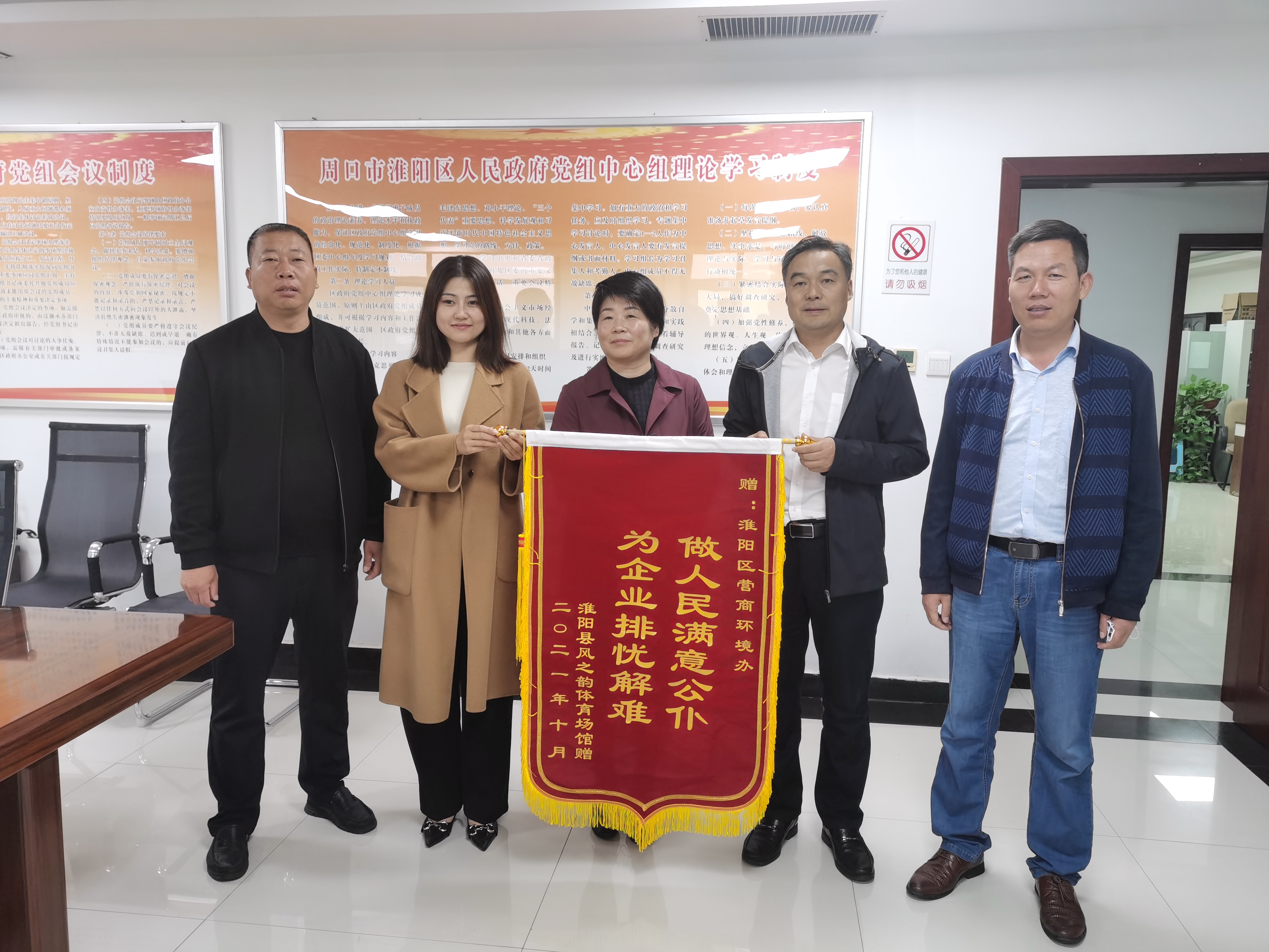 10月8日下午,淮陽區(qū)風(fēng)之韻體育館負(fù)責(zé)人把一面印著“做人民滿意公仆 為企業(yè)排憂解難”的錦旗送到淮陽區(qū)優(yōu)化營商環(huán)境辦公室,對(duì)區(qū)營商辦協(xié)調(diào)職能部門容缺辦理,快速解決企業(yè)痛點(diǎn)難點(diǎn)問題表示感謝。