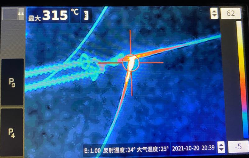 “蓮鄺線(xiàn)#19桿塔A相引流板連接螺栓發(fā)熱315℃,這屬緊急缺陷,需要立即處理!”10月20日晚,國(guó)網(wǎng)周口供電公司輸電運(yùn)檢中心在對(duì)110千伏蓮鄺線(xiàn)六級(jí)電網(wǎng)風(fēng)險(xiǎn)保電夜巡過(guò)程中,發(fā)現(xiàn)蓮鄺線(xiàn)#19桿塔A相引流板存在打火現(xiàn)象。