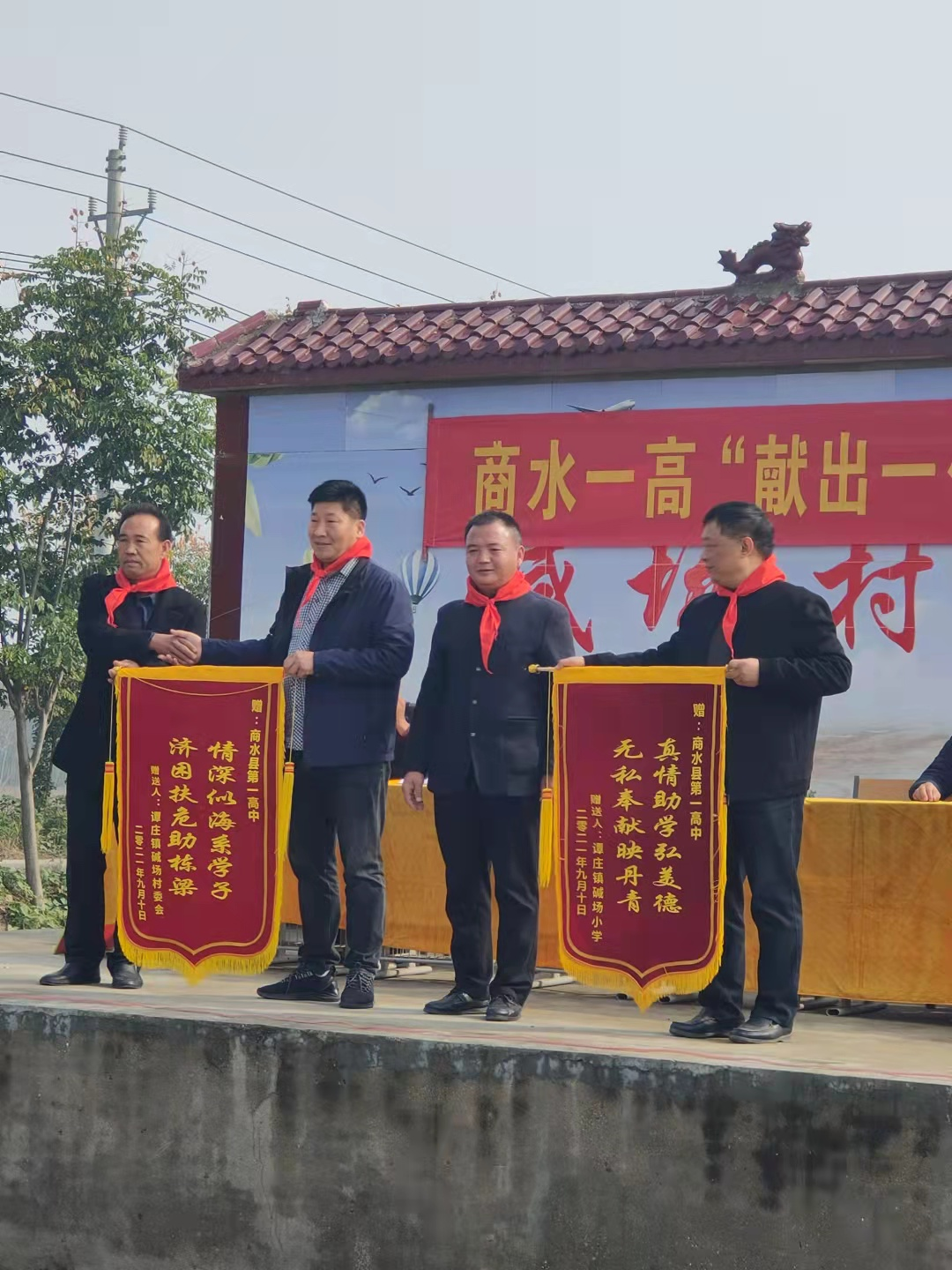 譚莊鎮(zhèn)堿場(chǎng)村村委會(huì)、譚莊鎮(zhèn)堿場(chǎng)小學(xué)分別向商水一高贈(zèng)送內(nèi)容為“真情助學(xué)弘美德,無(wú)私奉獻(xiàn)映丹青”“情深似海系學(xué)子,濟(jì)困扶危助棟梁”的錦旗。