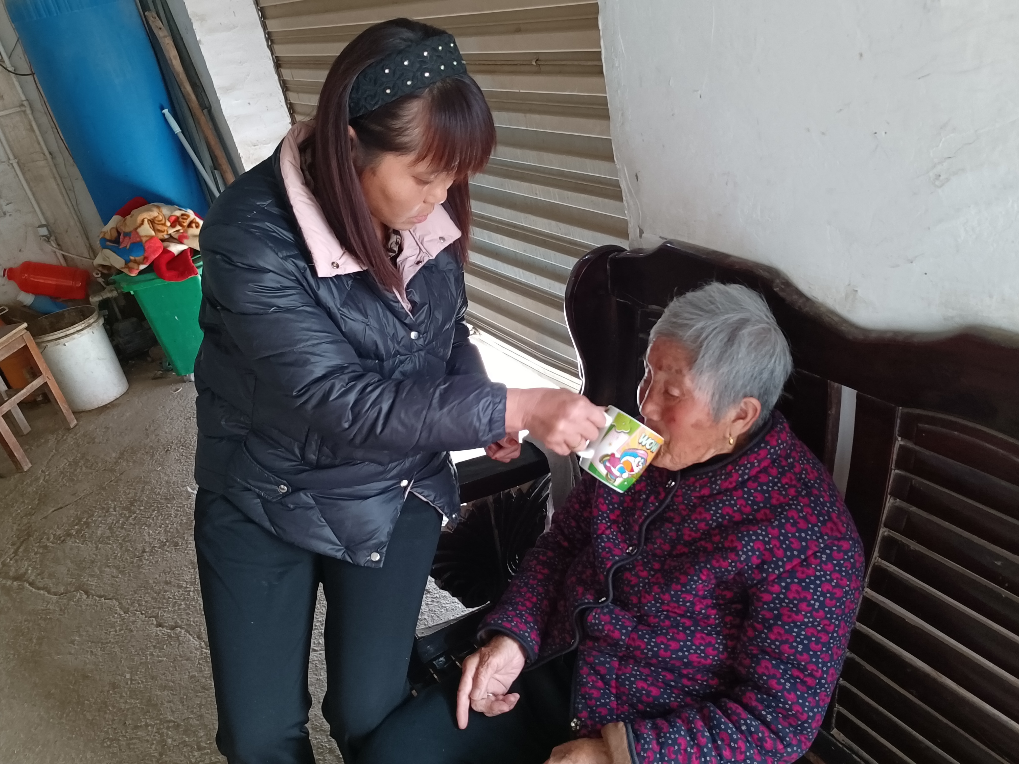 兒媳喂楊秀真老人喝水