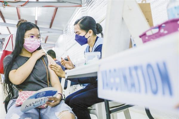 11月29日,民眾在菲律賓馬里基納的一個(gè)體育中心接種新冠疫苗。