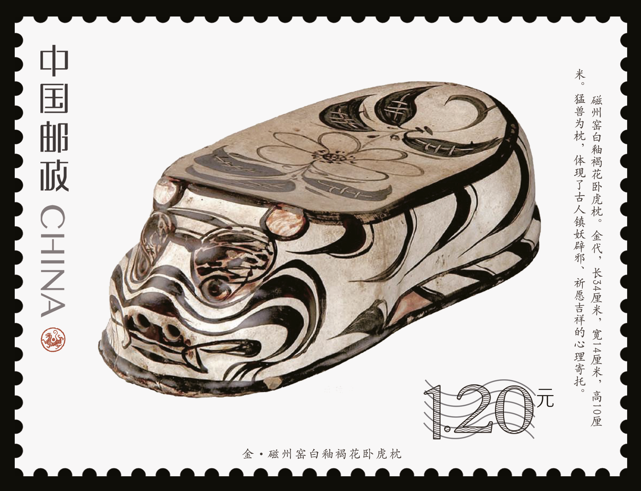 9月5日,由中國郵政特別制作的《虎文物》特種郵票正式發(fā)行。此套郵票共有6枚,每枚上都印有一件珍貴的虎文物。郵票圖案名稱分別為“商·伏鳥雙尾青銅虎”“春秋·青玉虎形佩”“漢·白虎瓦當(dāng)”“漢·錯(cuò)金銘文銅虎節(jié)”“金·磁州窯白釉褐花臥虎枕”“清·皮影飛虎”。其中第五枚郵票圖案中的“金·磁州窯白釉褐花臥虎枕”就是來自周口市博物館的珍貴文物。
