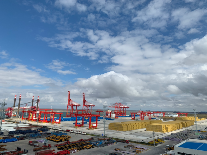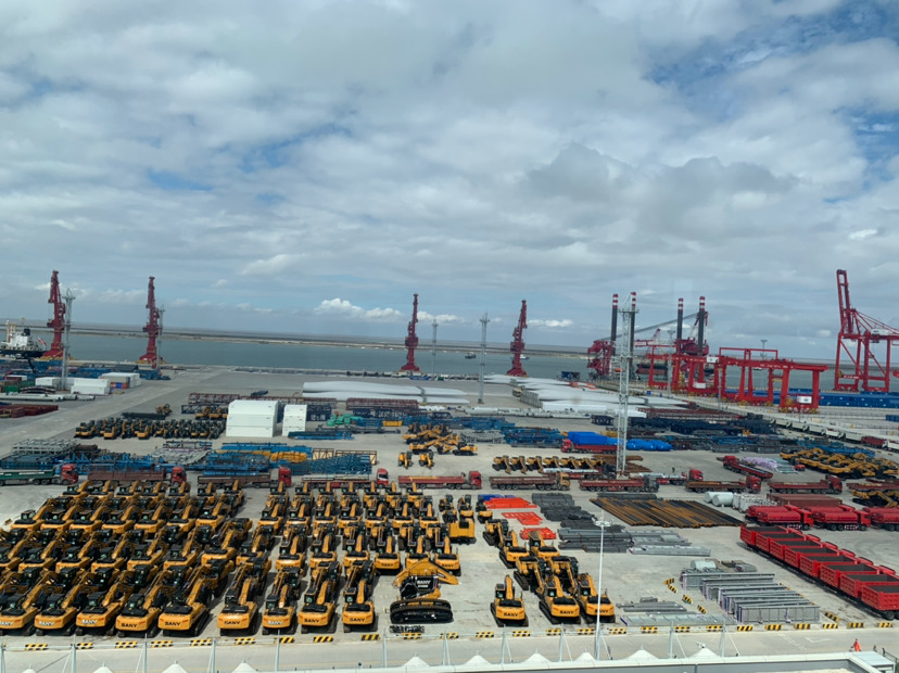 由于疫情防控的原因,記者沒能進入港口核心區(qū),只能站在港口辦公大樓樓頂遠眺港口。站在樓頂,港口景觀盡收眼底——挖掘機和風機葉片被“碼”的整整齊齊,正待裝船出口;機器不停運轉(zhuǎn),給??康拇谎b卸貨物;重型貨柜車進出有序、川流不息。而令人驚奇的是,諾大的港口空無一人。