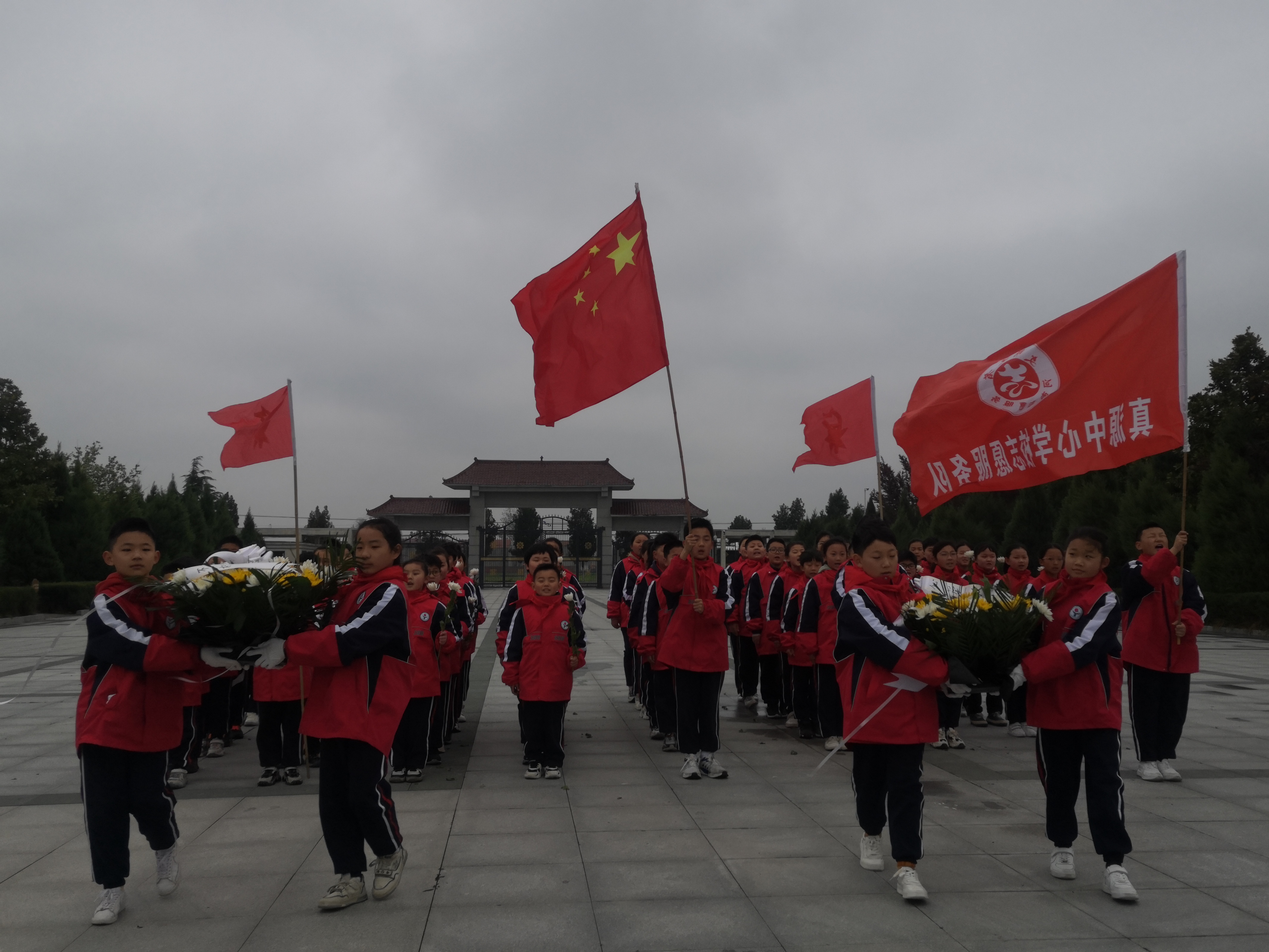 隨后,少先隊員代表獻(xiàn)詞,表明不辜負(fù)國家、社會重托,奮勇向前,頑強拼搏的志向。全體少先隊員莊嚴(yán)宣誓,師生們共同瞻仰紀(jì)念碑,祭掃陵園,敬獻(xiàn)鮮花。