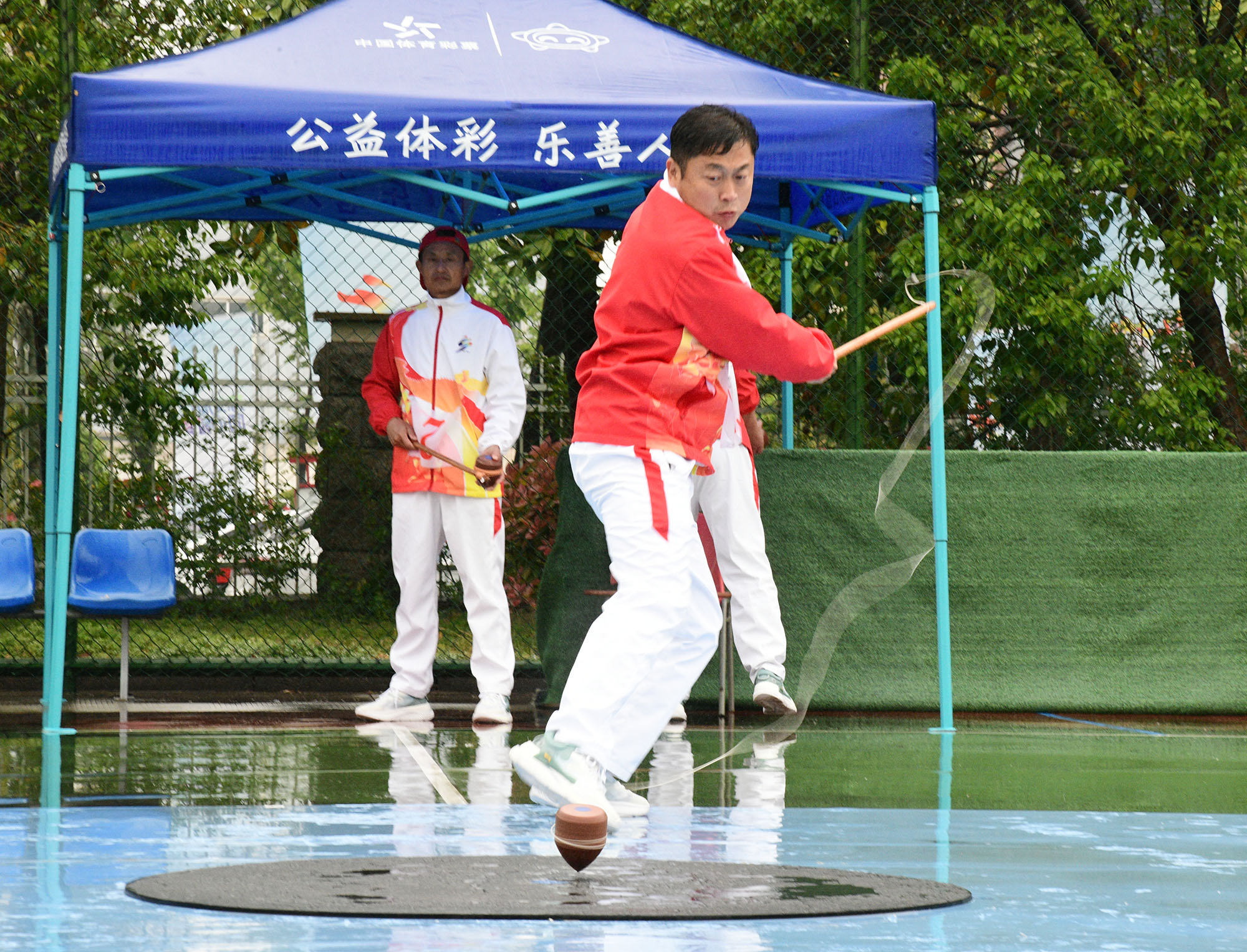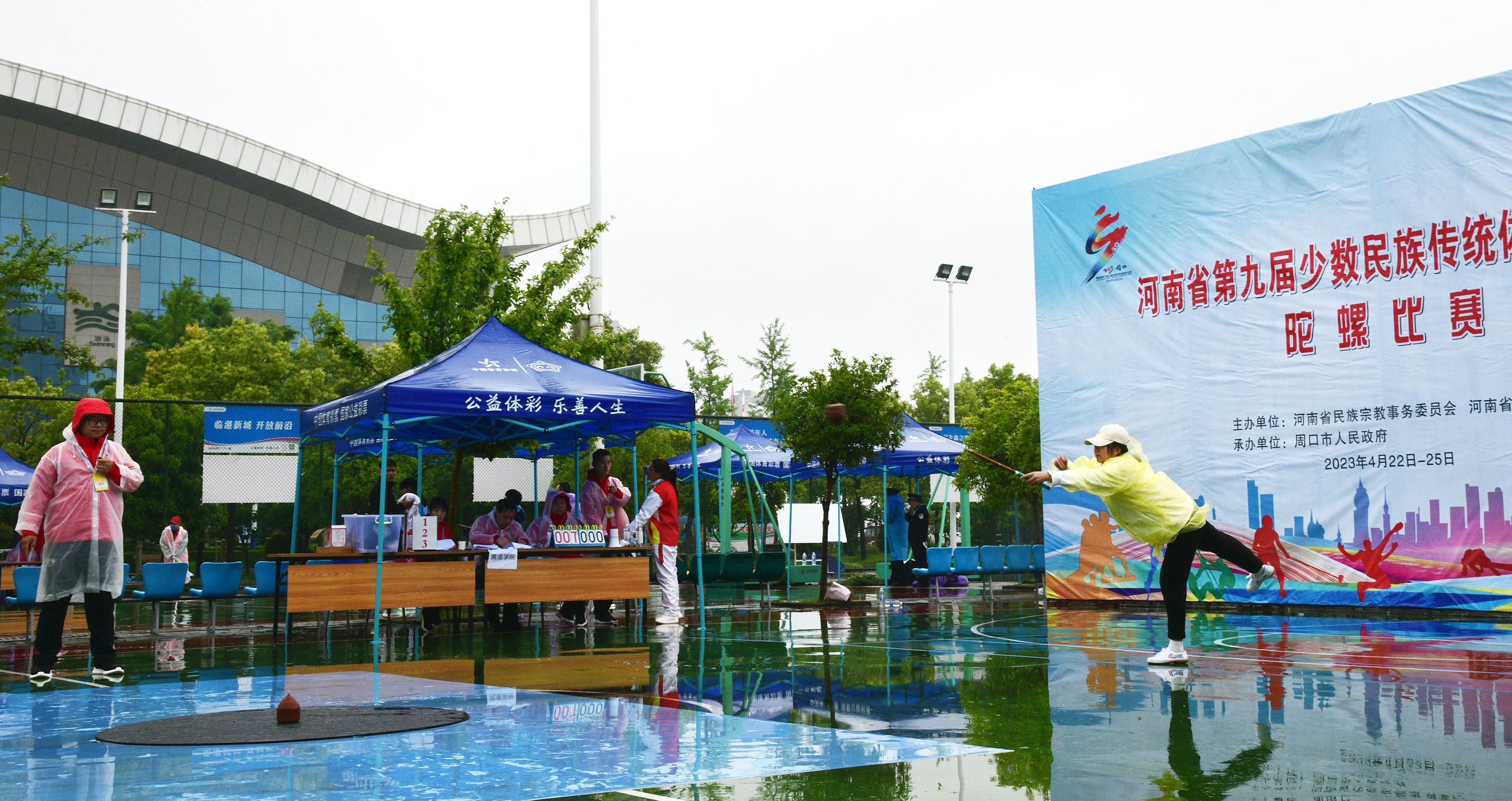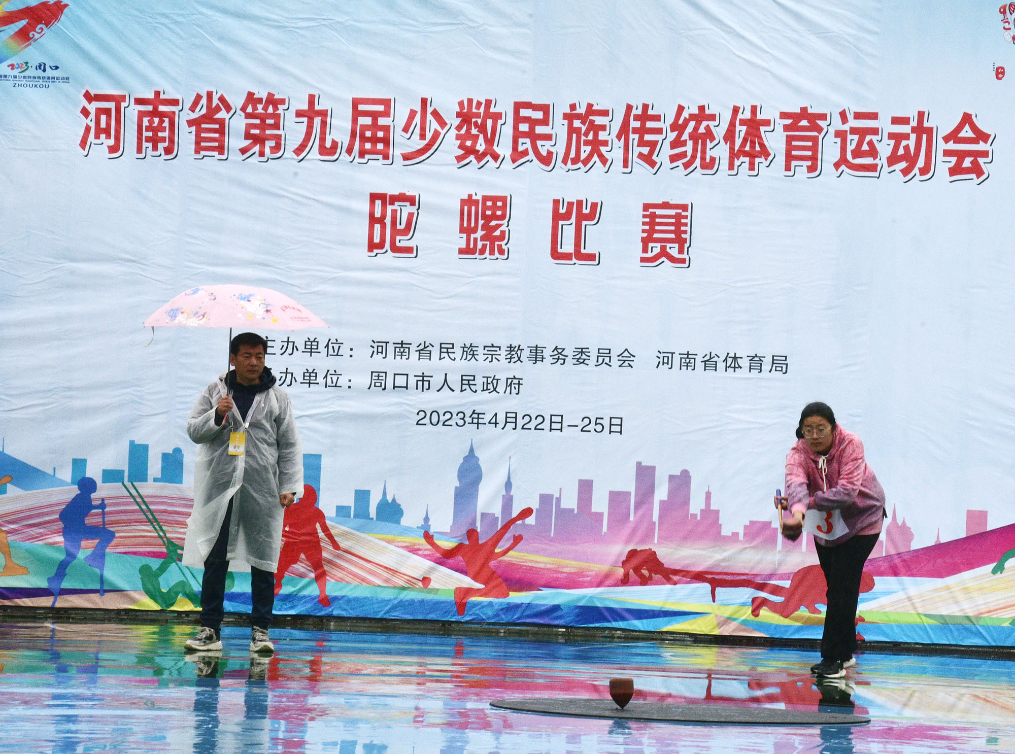 4月23日上午,河南省第九屆少數民族傳統(tǒng)體育運動會開賽。圖為在市體育中心進行的板鞋競速和陀螺比賽。記者 梁照曾 攝