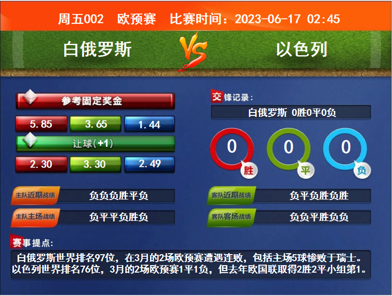 比賽時間:2023-06-17 02:45賽事提點:白俄羅斯世界排名97位,在3月的2場歐預(yù)賽遭遇連敗,包括主場5球慘敗于瑞士。以色列世界排名76位,3月的2場歐預(yù)賽1平1負,但去年歐國聯(lián)取得2勝2平小組第1。