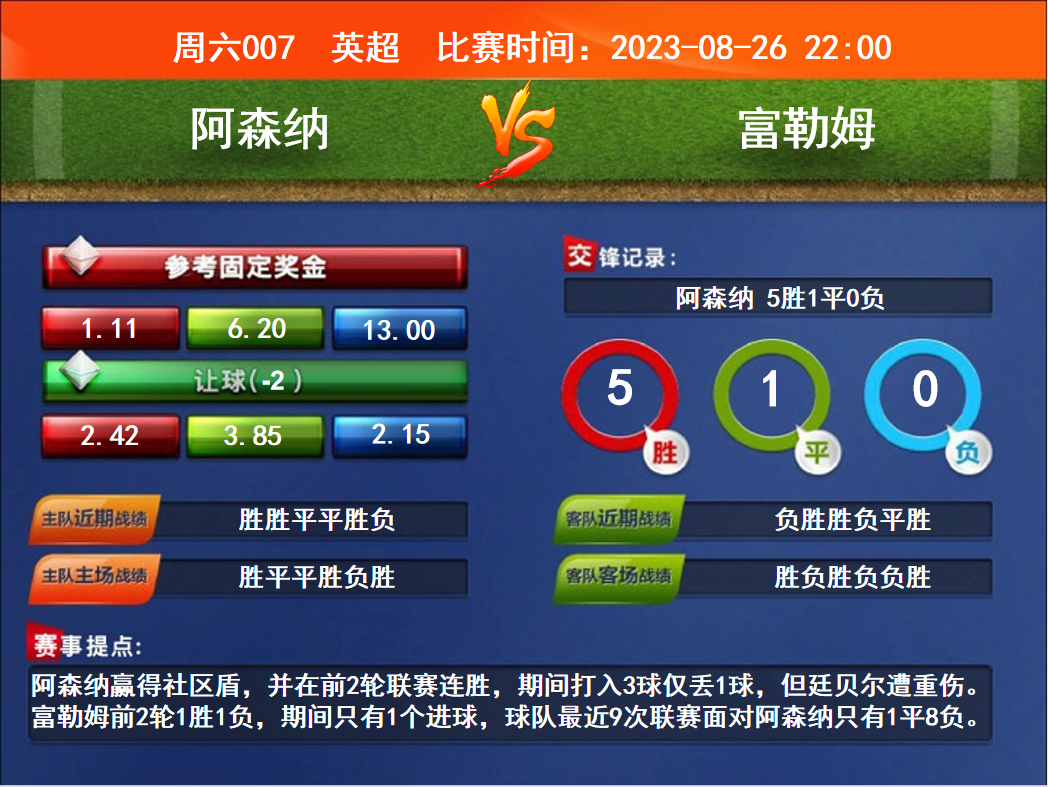 比賽時間:2023-08-26 22:00賽事提點:阿森納贏得社區(qū)盾,并在前2輪聯(lián)賽連勝,期間打入3球僅丟1球,但廷貝爾遭重傷。富勒姆前2輪1勝1負(fù),期間只有1個進球,球隊最近9次聯(lián)賽面對阿森納只有1平8負(fù)。