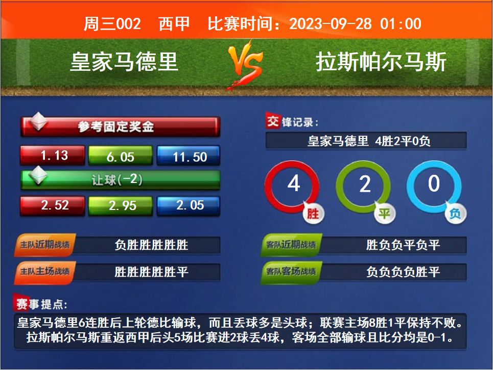 比賽時(shí)間:2023-09-28 01:00賽事提點(diǎn):皇家馬德里6連勝后上輪德比輸球,而且丟球多是頭球;聯(lián)賽主場(chǎng)8勝1平保持不敗。拉斯帕爾馬斯重返西甲后頭5場(chǎng)比賽進(jìn)2球丟4球,客場(chǎng)全部輸球且比分均是0-1。