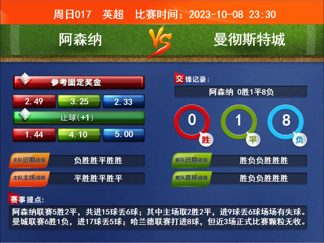 比賽時(shí)間:2023-10-08 23:30賽事提點(diǎn):阿森納聯(lián)賽5勝2平,共進(jìn)15球丟6球;其中主場(chǎng)取2勝2平,進(jìn)9球丟6球場(chǎng)場(chǎng)有失球。曼城聯(lián)賽6勝1負(fù),進(jìn)17球丟5球;哈蘭德聯(lián)賽打進(jìn)8球,但近3場(chǎng)正式比賽顆粒無(wú)收。