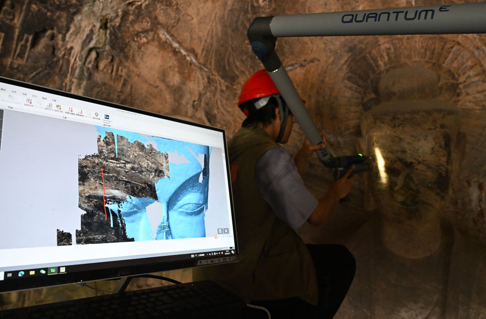 2025年4月9日,武漢大學文化遺產(chǎn)智能計算實驗室團隊成員在魏字洞使用關(guān)節(jié)臂掃描儀對佛像進行數(shù)字化掃描。圖片來源新華社