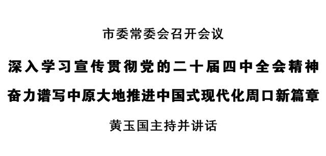 會(huì)議強(qiáng)調(diào),要把學(xué)習(xí)宣傳貫徹黨的二十屆四中全會(huì)精神,作為各級(jí)黨委(黨組)理論學(xué)習(xí)中心組集體學(xué)習(xí)的重要內(nèi)容,納入黨校(行政學(xué)院)教育培訓(xùn)的必修課程,做到黨員干部全覆蓋;各級(jí)宣傳部門要充分利用各種形式和手段,做好權(quán)威解讀和分眾化傳播,讓廣大黨員干部群眾聽(tīng)得懂、記得住、落實(shí)在行動(dòng)上;要把貫徹落實(shí)全會(huì)精神與習(xí)近平總書記在河南考察時(shí)重要講話精神緊密結(jié)合起來(lái),聚焦“兩高四著力”,錨定“1+2+4+N”目標(biāo)任務(wù)體系,落實(shí)市委“16232”總體工作思路,突出抓好重點(diǎn)項(xiàng)目建設(shè)和招商引資、農(nóng)業(yè)農(nóng)村、城市規(guī)劃建設(shè)管理、文旅發(fā)展、民生實(shí)事、社會(huì)治理等重點(diǎn)工作,全力以赴打贏“十四五”收官戰(zhàn),高質(zhì)量編制“十五五”規(guī)劃,切實(shí)把全會(huì)部署轉(zhuǎn)化為推動(dòng)現(xiàn)代化周口建設(shè)的實(shí)際行動(dòng)。