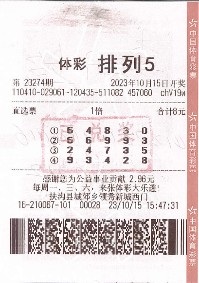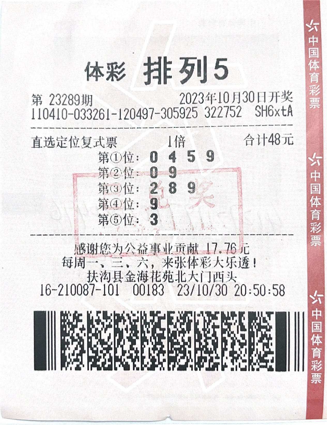 10月30日晚,體彩“排列5”第23289期開獎,開獎號碼為“9、9、8、9、3”。扶溝縣4116210087實體店喜中“排列5”一等獎1注,獎金10萬元。10月31日,中獎者陸先生來到周口體彩分中心兌獎大廳領(lǐng)取了獎金。