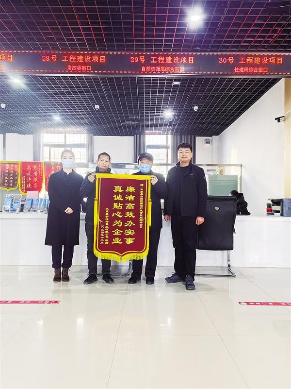 近日,太康縣某置業(yè)公司相關負責人將一面印有“廉潔高效辦實事 真誠貼心為企業(yè)”字樣的錦旗送到縣自然資源局,感謝工作人員為他們提供優(yōu)質(zhì)、高效、熱情的服務。