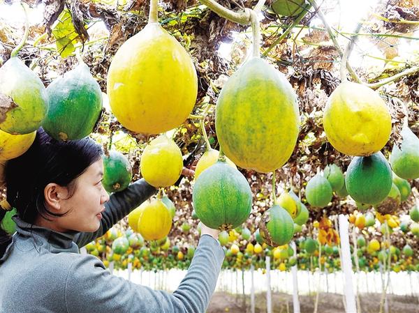 11月11日,記者在周營(yíng)鎮(zhèn)謝營(yíng)行政村一處生態(tài)瓜蔞產(chǎn)業(yè)基地看到,瓜蔞支架上藤蔓纏繞,一個(gè)個(gè)沉甸甸、金黃色的瓜蔞如同一盞盞燈籠懸掛在空中。村民正忙著采摘瓜蔞,整個(gè)基地呈現(xiàn)一派喜人的豐收景象。