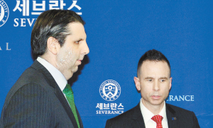 3月10日,在韓國首爾,美國駐韓國大使馬克·利珀特(左)在出院前出席記者會。當?shù)貢r間5日上午,利珀特在出席首爾世宗文化會館舉行的活動時,被一名韓國男子用刀劃傷,襲擊嫌疑人被當場抓住。