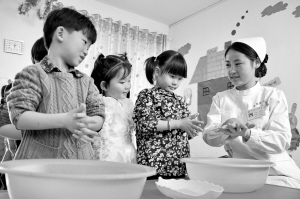 4月7日,醫(yī)務(wù)人員在為河北成安縣七色光幼兒園的小朋友講解正確的洗手方式。當日是世界衛(wèi)生日,河北省成安縣人民醫(yī)院組織醫(yī)務(wù)人員來到轄區(qū)幼兒園,為小朋友們講解如何正確洗手、刷牙等衛(wèi)生知識,讓他們認識到講衛(wèi)生的重要性,養(yǎng)成良好的衛(wèi)生習(xí)慣。新華社發(fā)