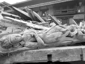 4月26日,在尼泊爾帕坦,杜巴廣場(chǎng)佛像倒塌、一片狼藉。新華社發(fā)
