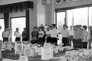 羅文閣在商務(wù)中心區(qū)規(guī)劃沙盤前聽取項(xiàng)目進(jìn)展情況匯報(bào)。丁宇濤 攝