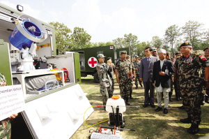 5月25日,在尼泊爾首都加德滿都,尼泊爾軍隊總參謀長拉納(前右一)在中國駐尼泊爾大使吳春太(前右三)的陪同下參觀中國捐贈的野戰(zhàn)醫(yī)院設(shè)備。