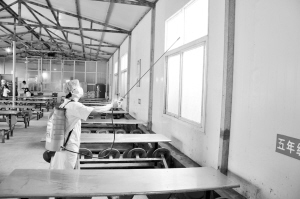 當日下午4時許,在該校食堂內(nèi),記者看到,消殺人員正在噴灑滅蚊蠅的藥物。墻壁、天花板、地面、餐桌……食堂的每個角落都被他們仔細地噴灑了一遍。