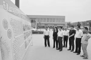 縣領(lǐng)導(dǎo)在雷爍光電廠區(qū)參觀首屆職工技能運(yùn)動(dòng)會展板。