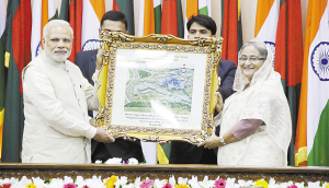 印度和孟加拉國簽署多項文件加強合作      6月6日,在孟加拉國達卡舉行的新聞發(fā)布會上,孟加拉國總理哈西娜(右)向印度總理莫迪贈送電站項目效果圖。孟加拉國總理哈西娜6日與正在孟加拉國訪問的印度總理莫迪舉行會談,兩國當天簽署多項文件加強合作。新華社發(fā)